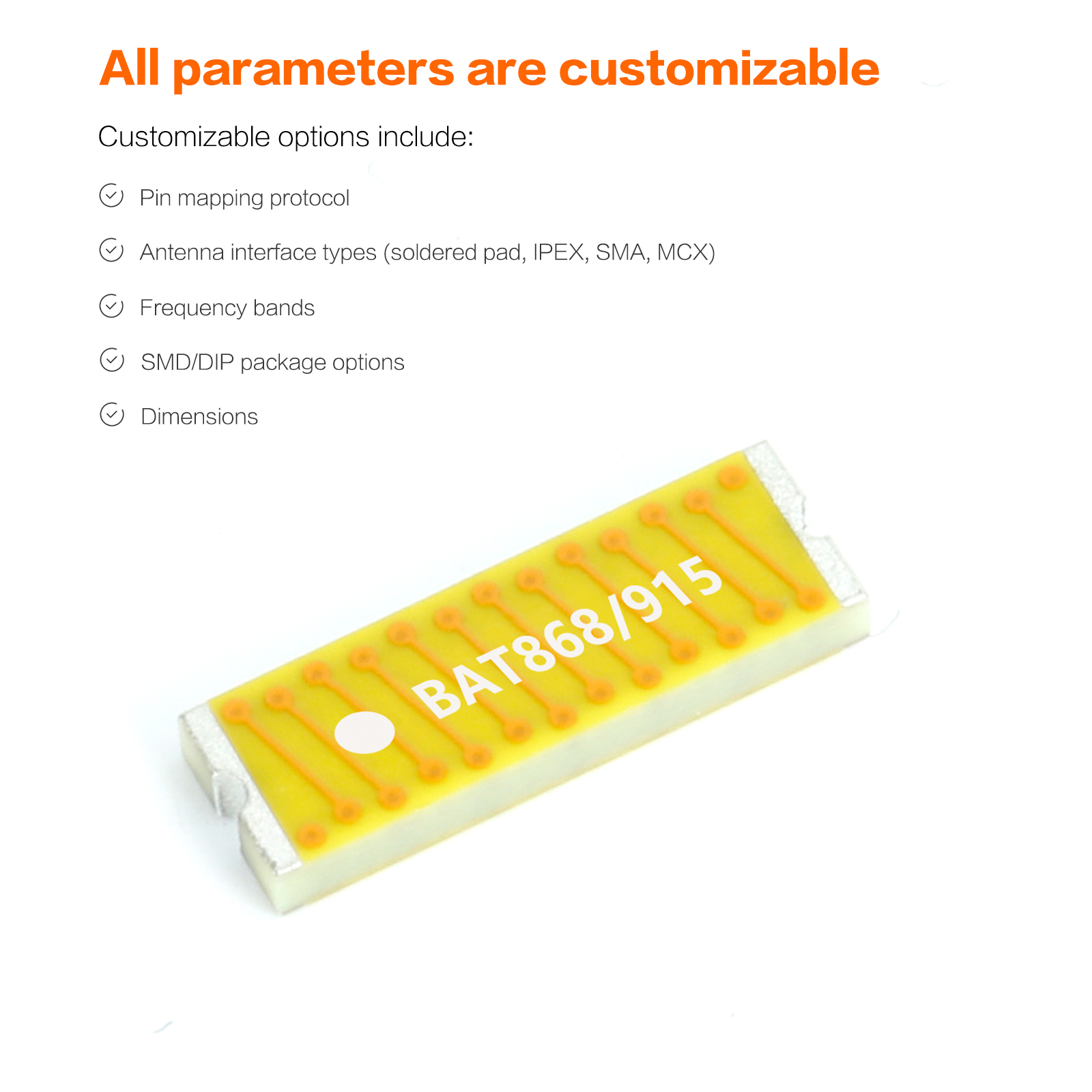 - "SMD Mounting + Orange-Yellow Marking" North American Production Line-Friendly Design: SMD technology is compatible with North American automated production lines, and the orange-yellow material improves recognition efficiency in North American production lines, shortening the production cycle; the compact size can be embedded into various North American micro terminals, solving the industry pain point of "difficult antenna integration in miniaturized North American devices" and accelerating product mass production.
